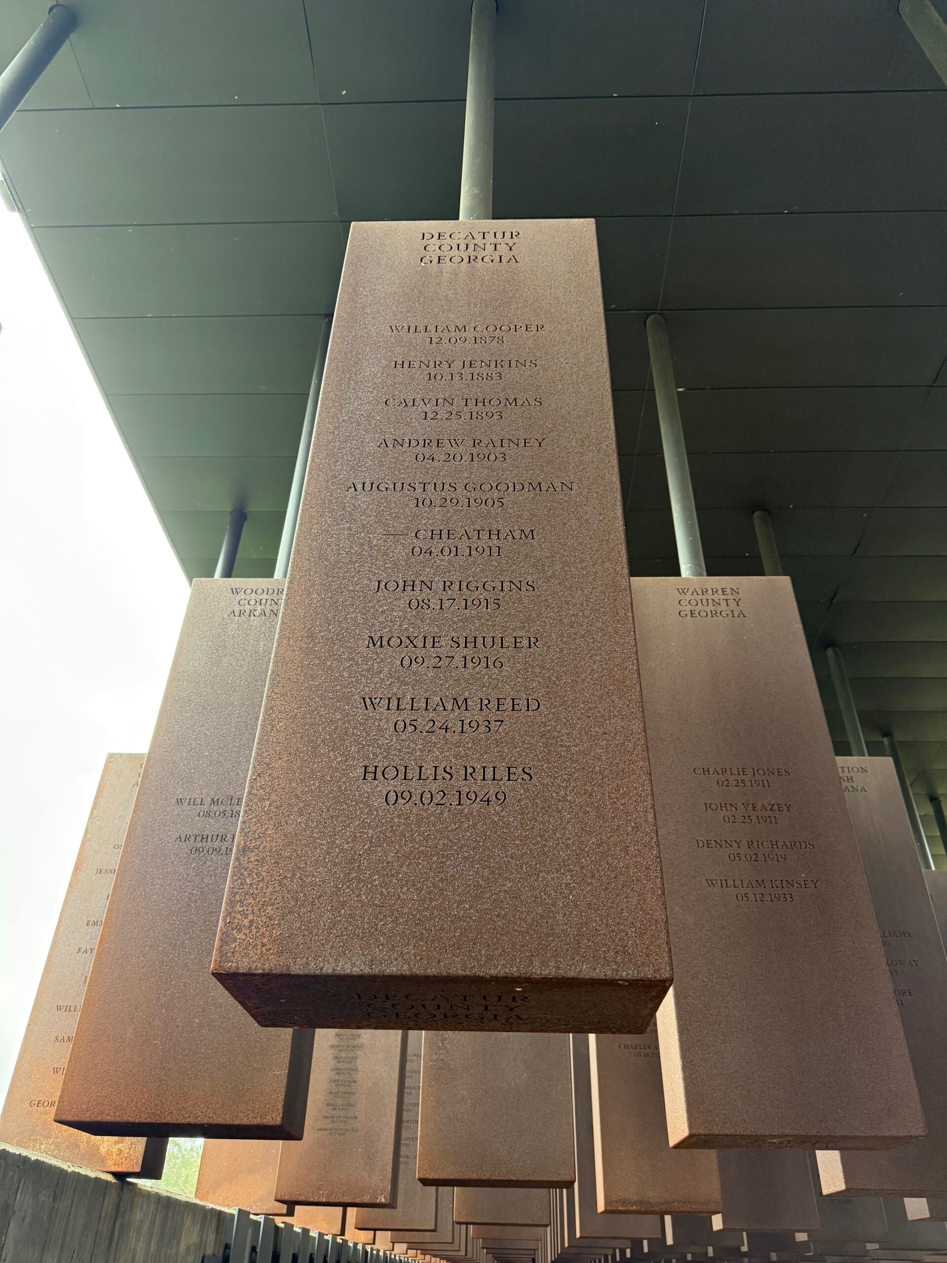 The National Memorial for Peace and Justice memorializes the more than 4,000 known lynchings in over 800 counties between 1877 and 1950. The dates start with the end of Reconstruction and end with a significant decline because of social changes and the beginning of the Civil Rights movement (although lynchings continued, as with Emmett Till in 1955). Lynching purposefully terrorized the Black population , enforced Jim Crow, and made white supremacy its core. The memorial stands on a hill, at the edge of a residential area, and overlooks a business district, with the new Greyhound Bus station, and on to the Alabama River. It is a double monument. The main section is an open-sided building around a courtyard, built so that you walk up to it and when inside, proceed down the hill in a spiral. Inside the shed, that reminds me of a tobacco barn, hang stellas made of Corten, a steel designed to rust to make a preservative layer. It’s a popular material for bridges and for sculptors, like Richard Serra, as the patina protects against any further corrosion. Each stella represents a county, named, along with the dates and names, if known, of the lynching in that county. Each stella is a rectangular box, like a coffin. The base of each stella is at the same height. At the entry, they are touching the ground but as you proceed down and through the monument, they hang higher and higher above your head. In the base are the county and state names. Outside the memorial building, the stellas are repeated. This time, lying on the ground with the county, state, and incised names of victims uppermost. This display of replica rectangles is expected to be temporary as the counties named can claim their own stella when they take actions to acknowledge the history of their community and memorialize those murdered. The memorial was as moving as I had expected, but the point where my knees almost buckled was when the staff pointed out I was standing under the name of the last person memorialized — Decatur County, Georgia, Hollis Riles, 09.02.1949.