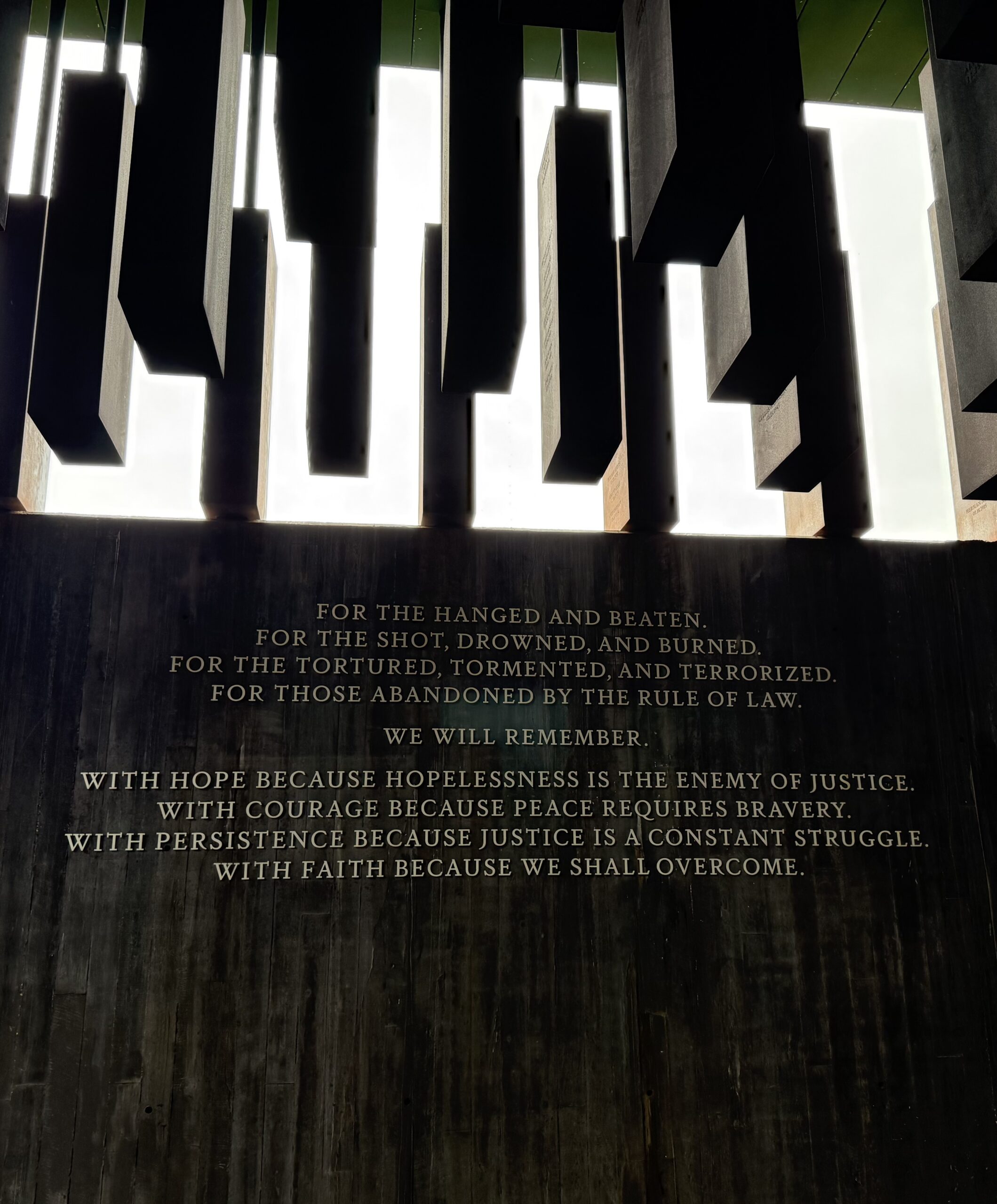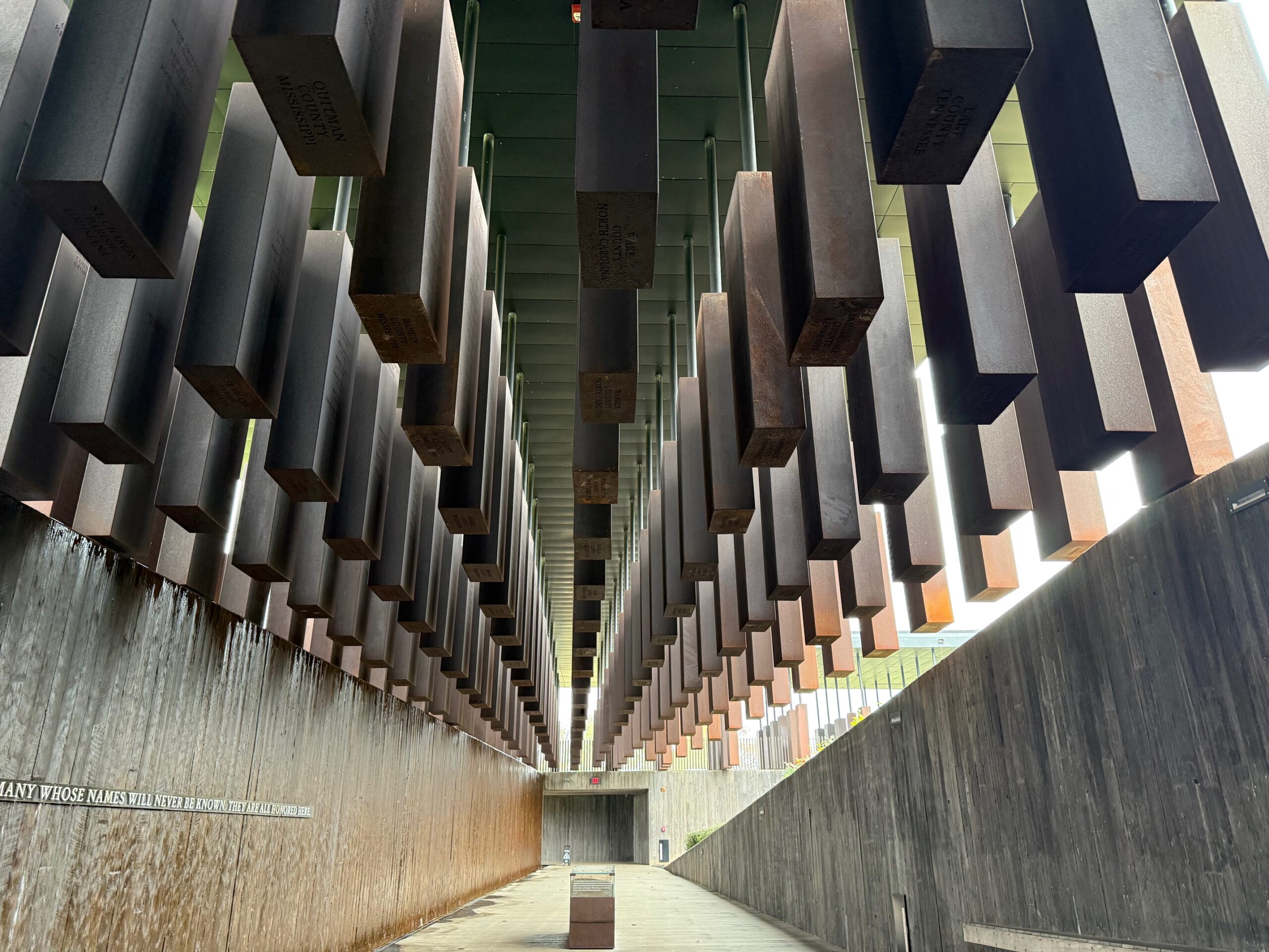 Montgomery had been my terminus because I wanted to experience the National Memorial for Peace and Justice. Built by the Equal Justice Institute, it is one of three of their sites in Montgomery to memorialize the brutality against Black Americans, tell the full and constant story of injustice against Black Americans, and also to celebrate all the cultures that have been oppressed, marginalized, and brutalized through the founding of this country and the work to make the project: All Men Created Equal a reality. I am optimistic despite my current dread.